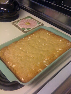 Today I baked one of my fiance's favorite family recipes: White Chocolate Cookie Bars. The kids were all very excited with anticipation while I was baking and the smell of vanilla and white chocolate flooded the house with warmth and good feelings.